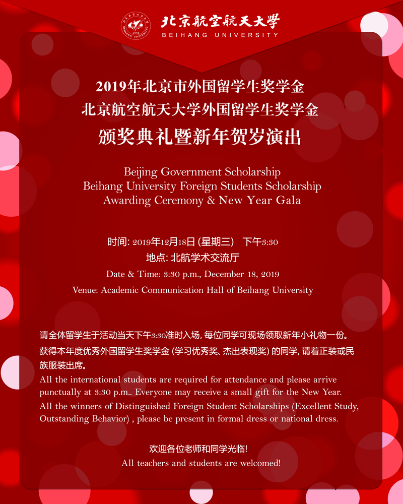 Awarding Ceremony of Beihang University Foreign Students Scholarship 2019 will be held on December 18, 2019 at Beihang University.